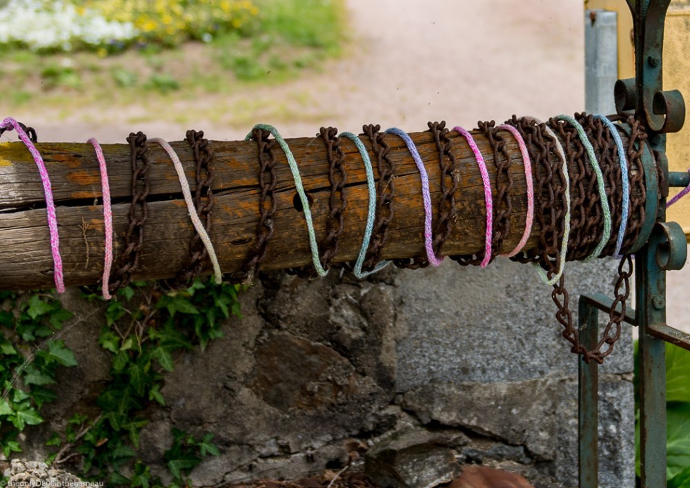 Next weekend, the nearby village of Saint-Martial-sur-Isop is holding a two-day ‘Fête de la Laine’ – a wool festival. Already, the village is decorated with wool – around telegraph poles, on benches and also, as here, wrapped around the wooden winding piece and rust chains of an old well. Plenty of textures here: