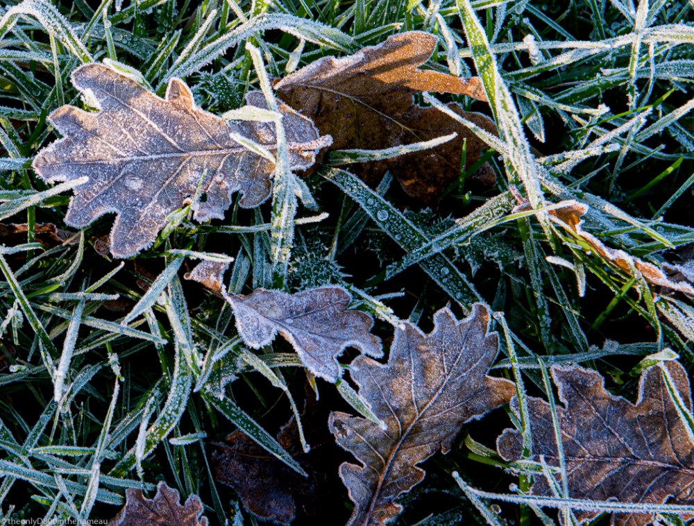 Fallen oak leaves lie in the frosty grass.