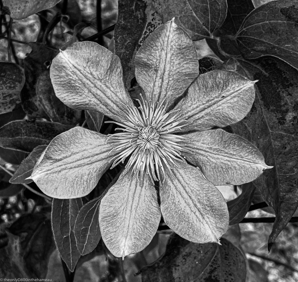 This clematis is actually a delightful shade of purple, but in black and white it contrasts very well with the green leaves behind. The monochrome treatment also helps to highlight the intricacy at the centre of the flower.