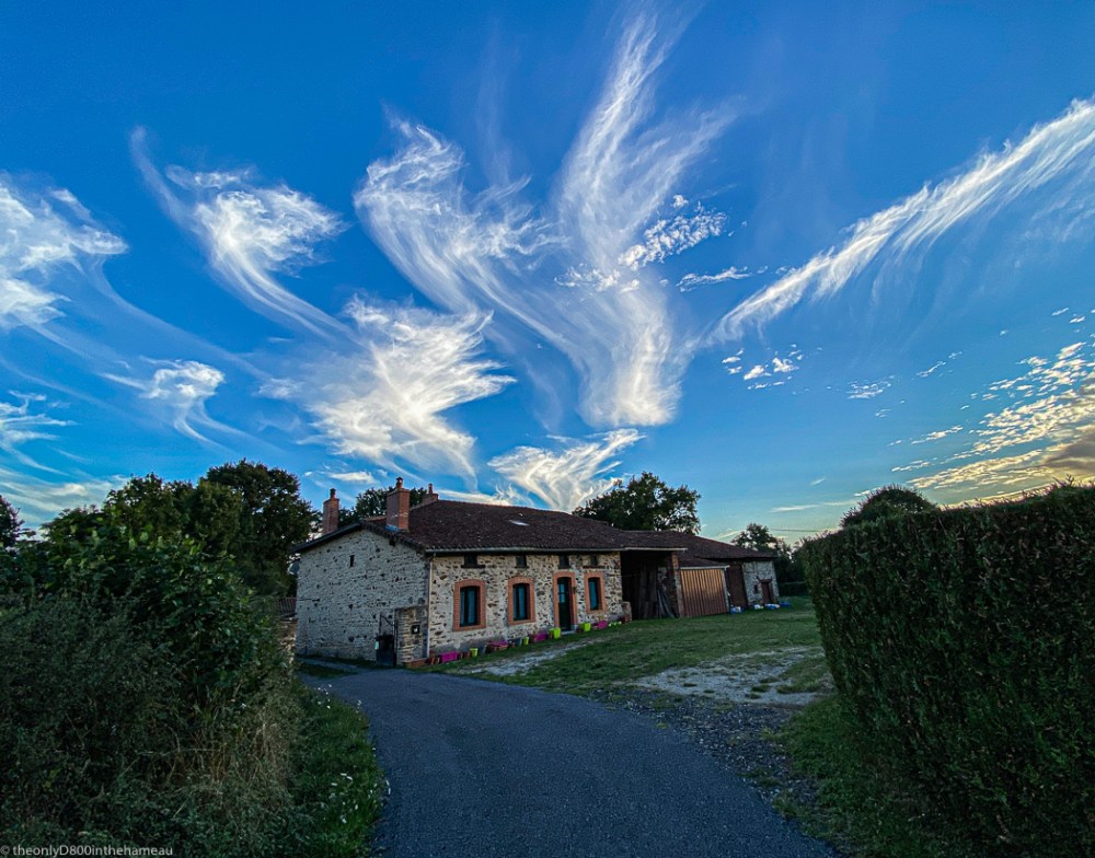 Arguably, this image – of a striking cloud formation seen over our house in the gathering dusk – shows three of the five classical elements: Air (obviously), Water because that’s what clouds are made of, and Earth, which is what Brokedown Palace is sitting on (and built from).