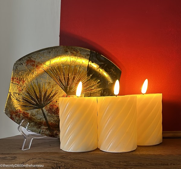 Even though the candles are battery-operated, they do produce a lovely warm glow when set in front of this decorative plate.