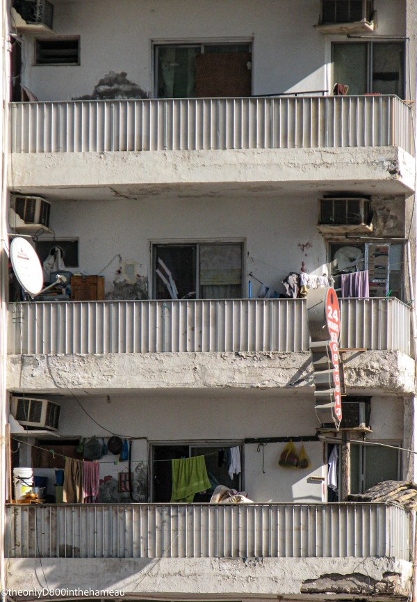 The popular image of Abu Dhabi focuses on the prosperity, and even luxury, of its built environment (as I suppose the architects would describe it). Beneath that marbled surface sheen, however, are the far less salubrious spaces occupied by largely unskilled immigrant workers, many of whom have to live packed in to tiny apartments in crumbling concrete blocks. Here, balconies are not for enjoying the sunshine but making the most of the available space.