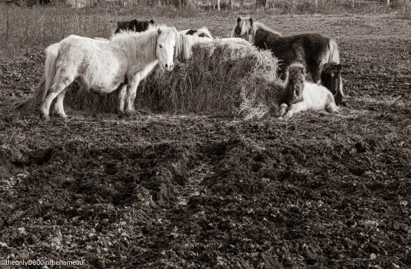 Shetland ponies may not be everyone’s first idea of a farm animal, but one of our neighbours breeds horses (and a few cattle, but that’s almost compulsory in these parts) for a living. For a while, he also owned this small group of Shetland ponies, which were kept in a field less than a quarter of a mile from our house (aka Brokedown Palace).