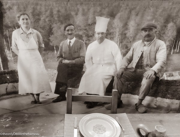 This is part of a tableau in a museum set in an old chateau (I forget exactly where, unfortunately). The table is set with furniture and crockery of the interwar years, but what made it stand out for me was the blown-up to life-size old photograph that had been somehow printed onto a cloth sheet to form a backdrop to the scene.