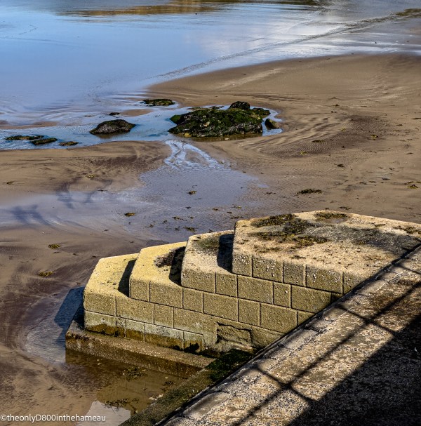 This photo was taken from the promenade in Scarborough at low tide last summer. My eye was caught by the juxtaposition of the stark lines of the steps with the abstract free-form ripples and reflections in the pools of water.