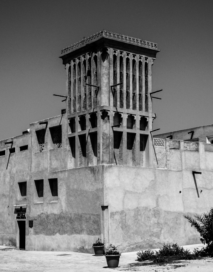 Cee’s theme for this week’s Black & White Photo Challenge is ‘Hot and/or Cold’. Here is an image that encapsulates both. This is a wind tower in al-Bastakiya – what’s left of the old part of Dubai. It works on the principle of drawing in the desert breezes at the top and funneling them down to provide a cooler draught at ground level. Air-conditioning, in other words.