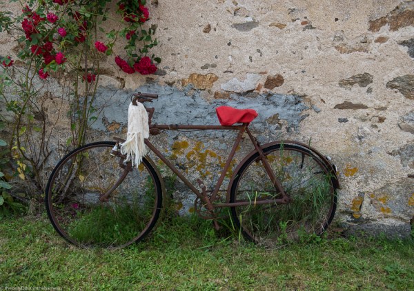 An artfully rusted bicycle propped up against a wall in the village of Saint-Martial-sur-Isop during last weekend’s Fête de la Laine (hence the woolly decorations).