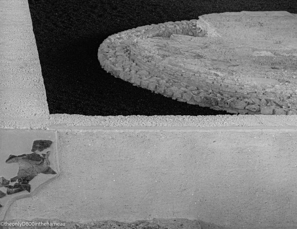 This photo shows a detail from the Roman museum in Perigueux. It’s part of a carefully reconstructed Roman villa which is replete with statuary and carved stonework. However, I thought this crop made for an interesting abstract image when rendered into monochrome.