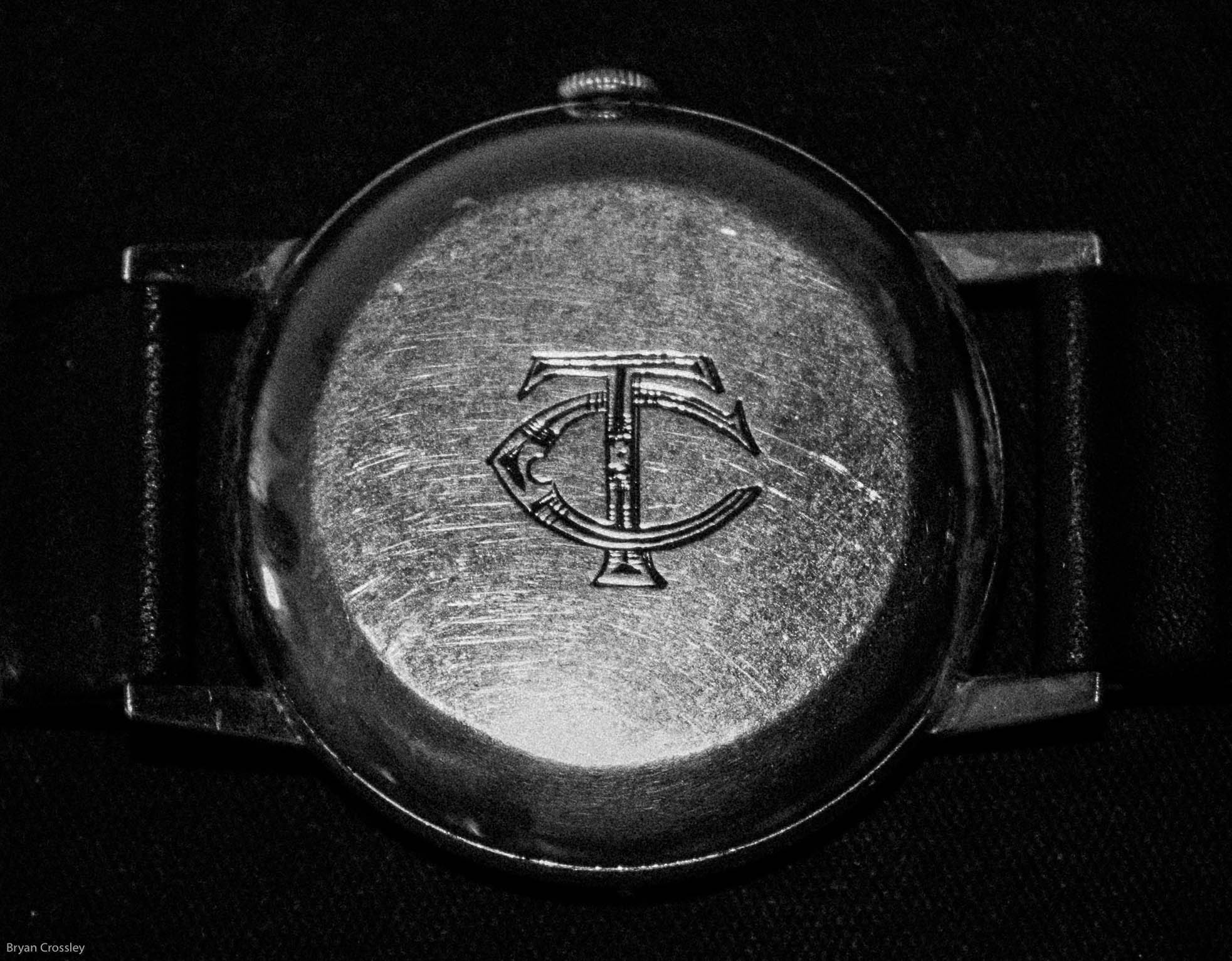 This is a photograph of the back of my watch. Except that it isn’t really my watch. It’s the one that was presented to my grandfather on the occasion of his retirement in 1961 – at the age of 74. Those are his initials: TC.