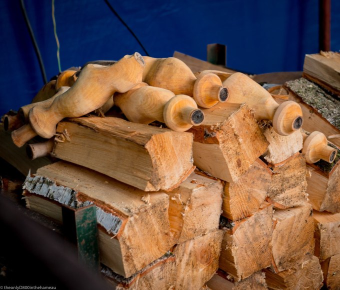 Often to be seen at the vide-greniers and miscellaneous Fêtes around here is an artisan who makes wooden clogs in the traditional manner – hand-turned on a lathe. This is his raw material.