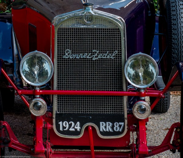Detail of the bodywork of an immaculately maintained vintage car, from a display at nearby Chateau Fraisse.