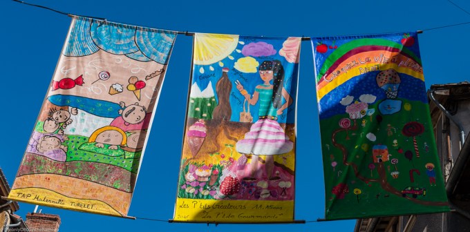 For Cee’s Midweek Madness Challenge this week, we are invited to draw inspiration from an image posted by guest host Rita. Her photograph includes some flags, so here are three colourful banners spotted during a summer festival in the Auvergne city of Thiers.