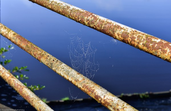 For the first topic she has challenged us to post an image that contains an item in one of her own photographs. The one she chose featured a fence, which gives me an opportunity to post this photograph of a spider’s web spun between two railings of a fence by the river Vienne in Chabanais.