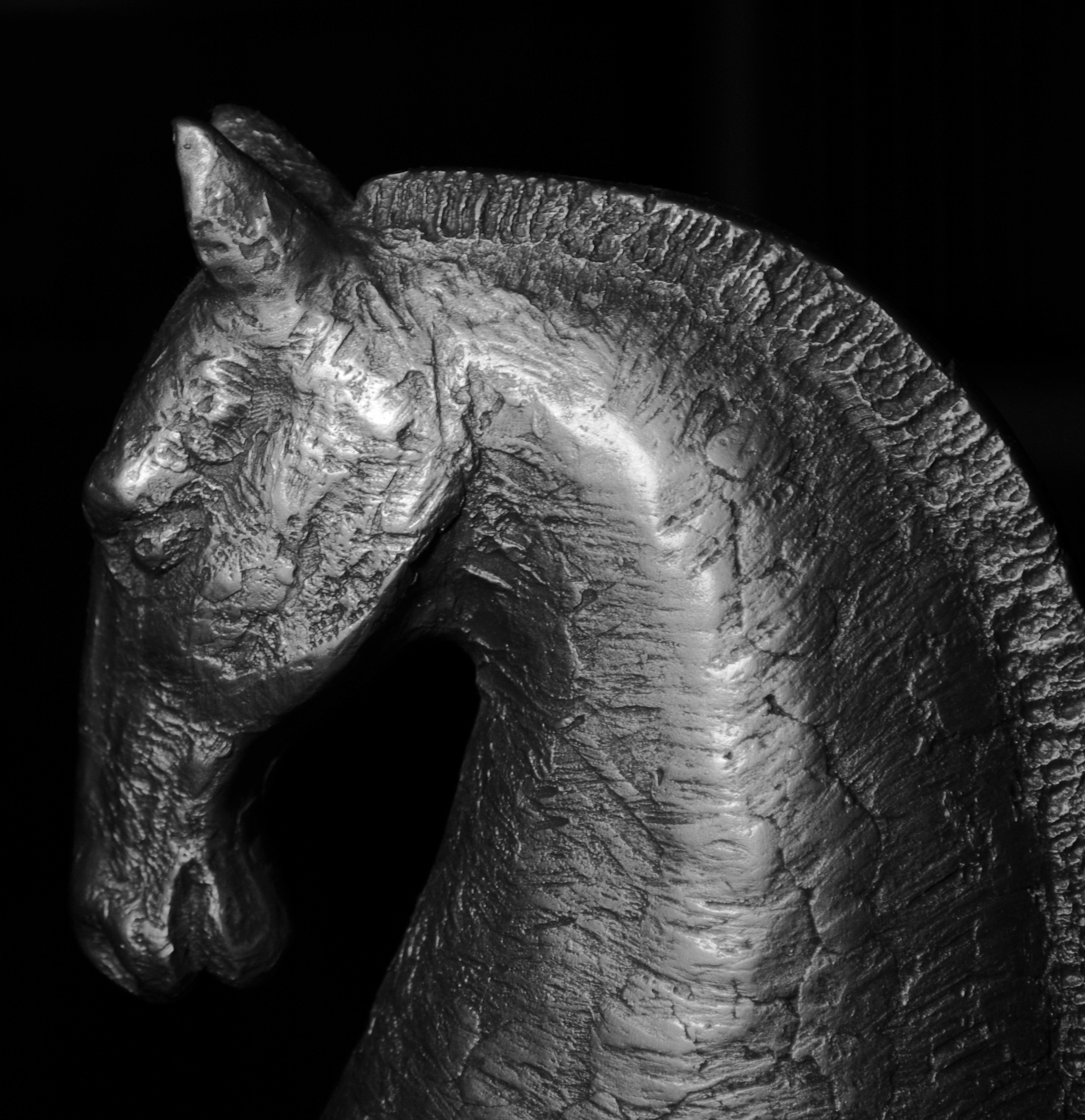 Detail of a carved wooden horse that sits on a table in our salon. The monochrome conversion (the real thing is actually bronze-coloured) highlights the interesting textures of the piece.