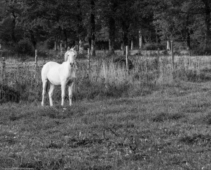 This striking white horse is one of a group of about half a dozen or so that belongs to one of our neighbours.