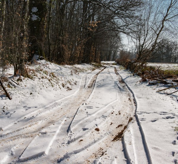 Now, two photographs of the same scene, one in landscape, the other in portrait. Unsurprisingly, the vertical represented by the tyre-tracks is a much stronger element in the portrait version; this makes sense because it’s the tyre-track that’s the real subject, and the trees in the landscape version are just a distraction: