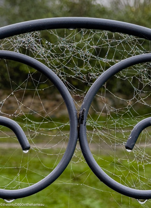 As for the rest, here’s some dew (water) on a spider’s web woven on the back of a metal (sic) chair in our back garden (earth).