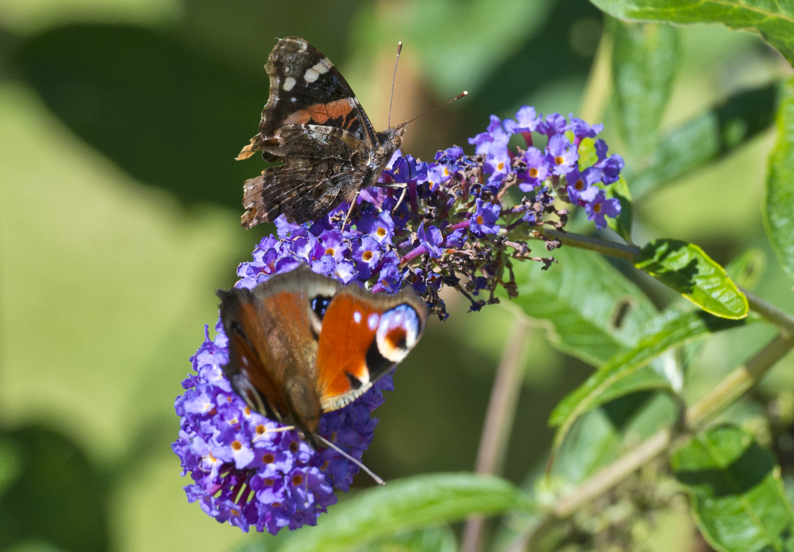 Not sure that these two butterflies, captured on my buddleia (“butterfly bush”) this very afternoon, had much to say to each other, but there was probably a dialogue of some sort going on.